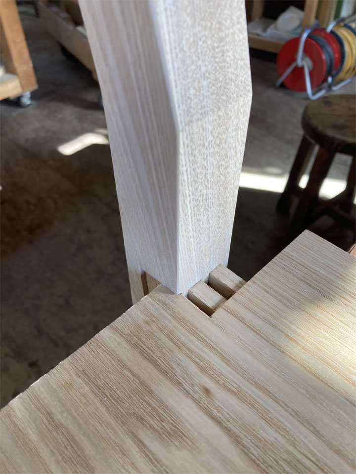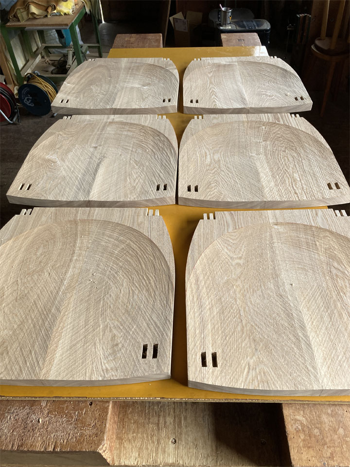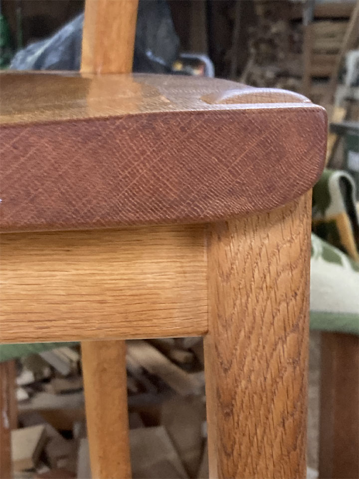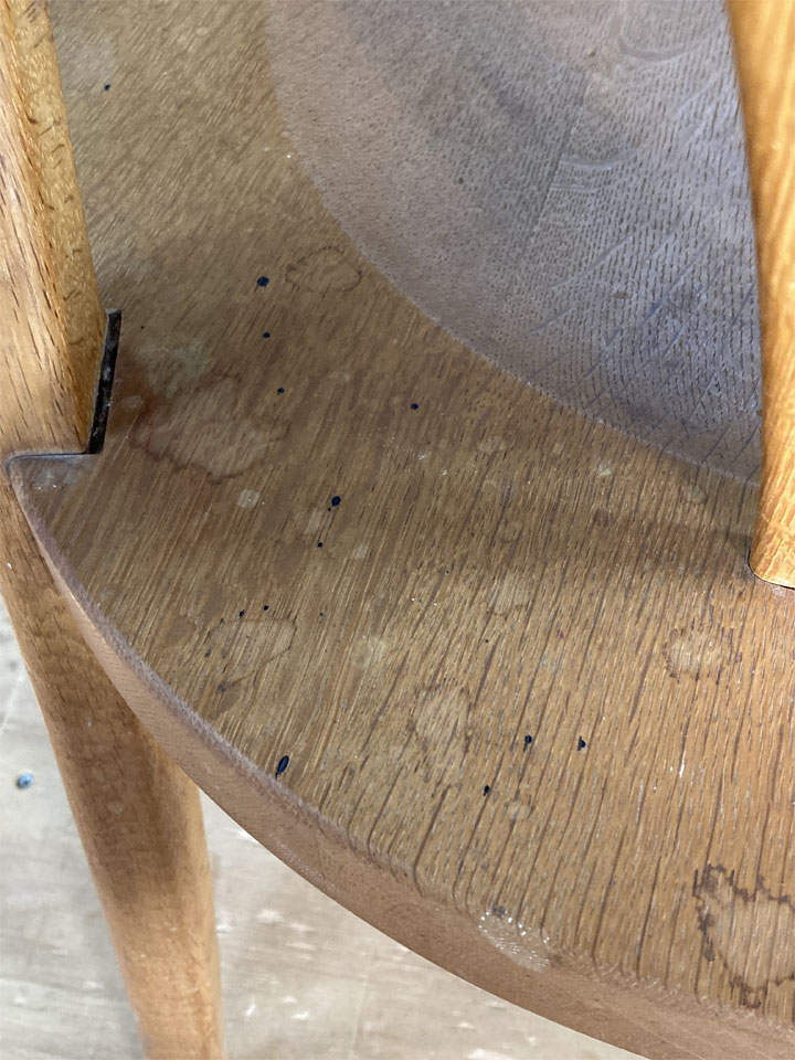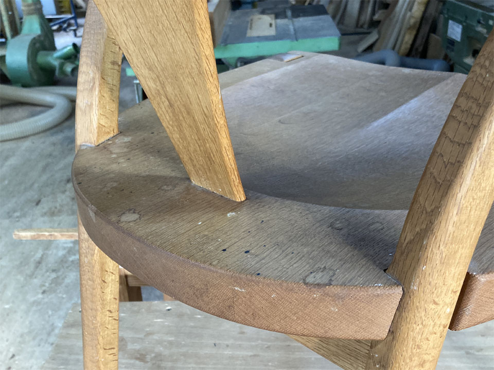 そのKさんが長年陶芸の工房に置いて、作業の合間や休憩の際に腰かけてみえたのでしょう。長く使っていただいたことに感謝です。(この椅子の他にも、ろくろの前で座って使うスツールもお作りしました。)しかし、まぁまぁ過酷な環境に置かれて使われたようで、汚れは言うまでもなく、脚が緩んでいたり、少し接ぎ切れも見られました。