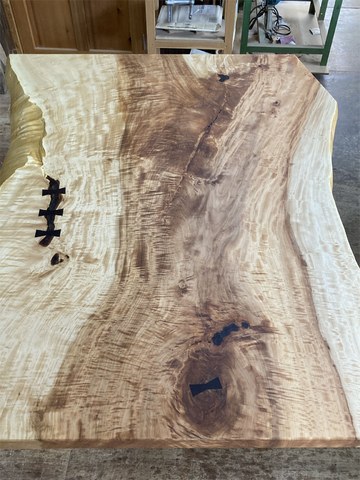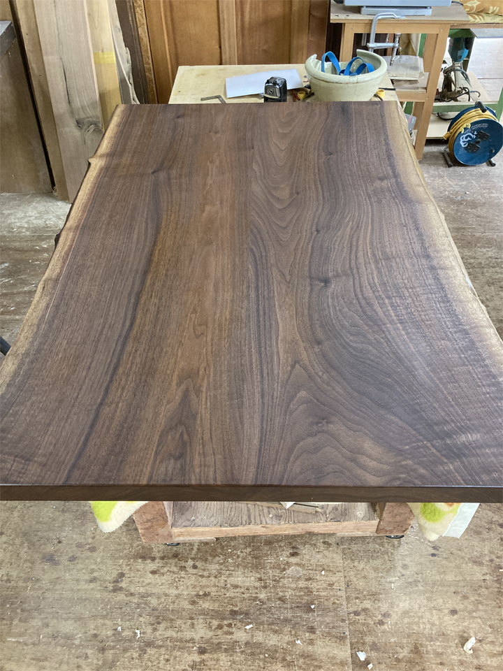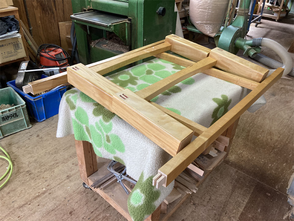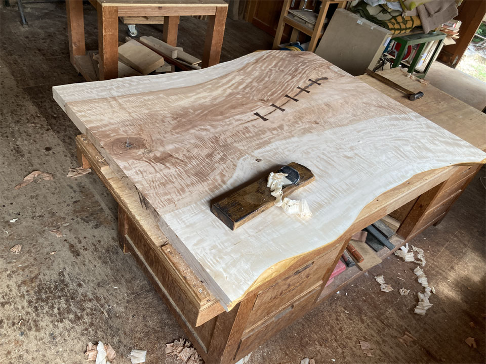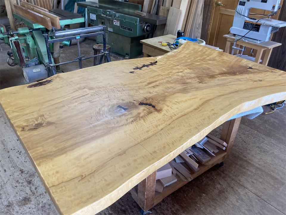 実はこの後も2件、同様の仕事が入っています。1件は無垢一枚板の座卓をテーブルにリメイクする仕事。こちらは10年前に納品させていただいた物です。極上杢の栃の無垢一枚板です。もう1件は3年前に納品させていただいた「厨子」の補修です。扉が少しきつくなったので直して欲しいとのことです。
