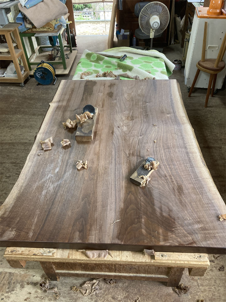 こちらも先の栃のこたつ同様に、9年経っているとは思えないほどきれいに使っていただいていました。見ると裏面はそのままでいけそうなので、表面だけを削りなおすことにしました。とはいえ、反りがありますので鉋仕上げにはなかなかの時間がかかりました。