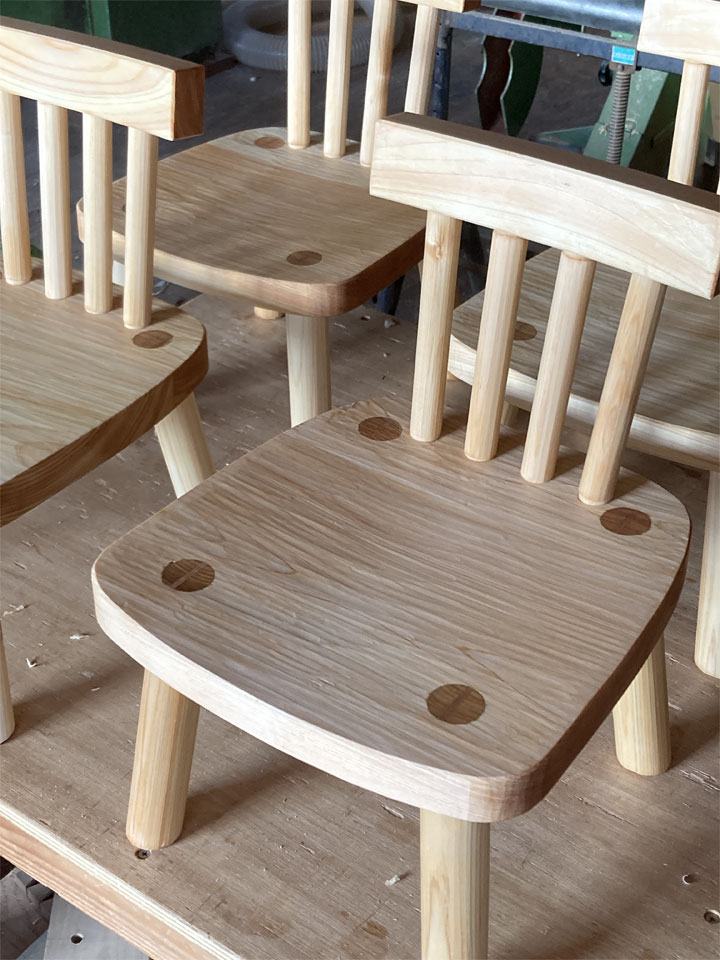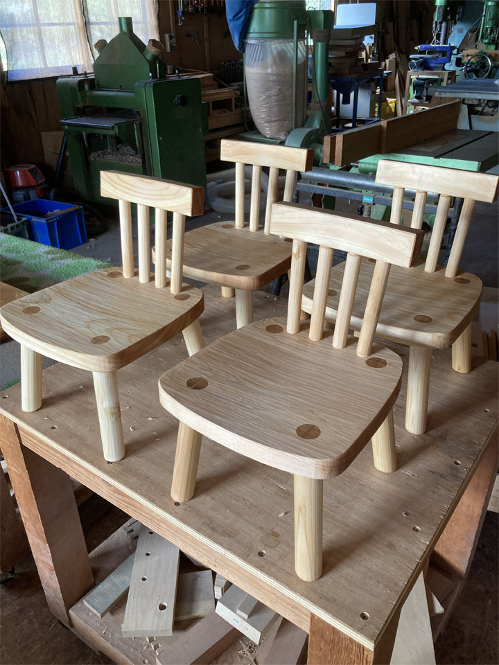 ミニ展示会ですが、新作の小物も用意するつもりで進めています。その一つですが、定番の「ベニマツの子供椅子」を「ひのき」を使って制作した、「ヒノキの子供椅子」です。