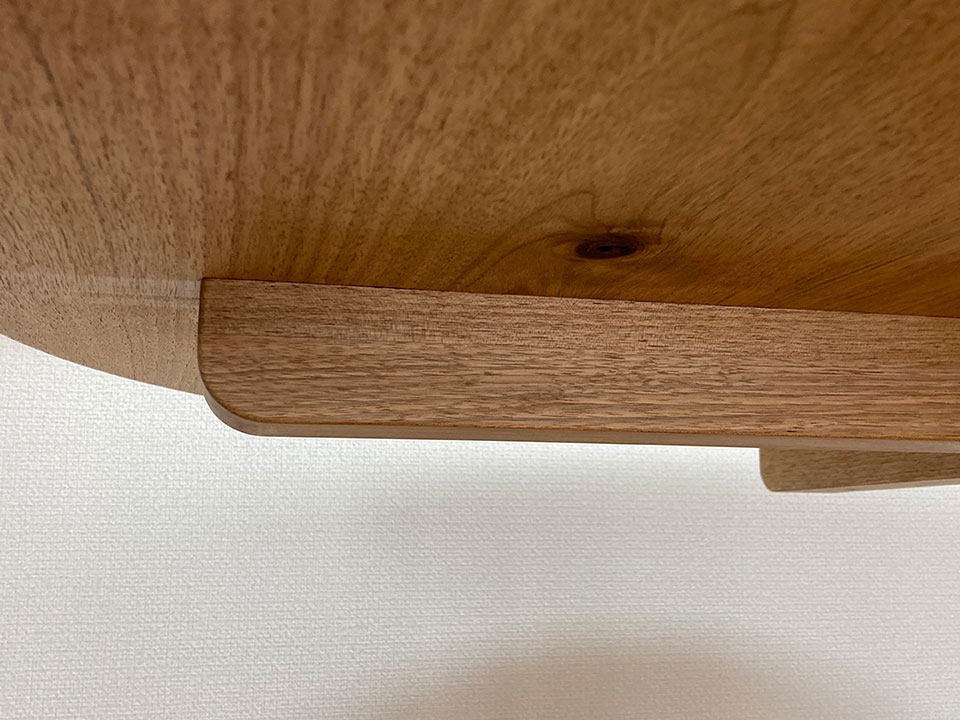 通常、円卓の天板には「接ぎ合わせ板」を制作して使用します。大きさにもよりますが、5枚接ぎ、6枚接ぎなど複数枚の接ぎ合わせ板です。(特注で2枚接ぎ、3枚接ぎということもありますが…。)厚みも基本的には30mmで作っています。(特注の場合は変わります。)